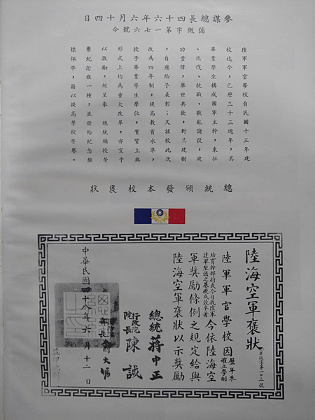 民國48年6月12日,由時任總統蔣中正先生,特頒發陸軍官校榮譽徽,以資鼓勵學校改制為四年之功績。